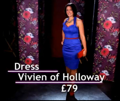 At the end of the show, Gok's three ladies were made-over with dazzling results! Thanks to a little touch of Gok's customising magic, our Royal Blue Halterneck Pencil Dress was given a delicate red trim around the sweetheart neckline, co-ordinating nicely with her skinny red belt and fabulous red heels. He also shortened the length by a couple of inches, so that it sits just above the knee.